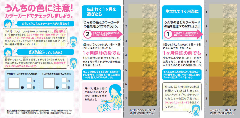 このカードは母子手帳に挟まれており、赤ちゃんの便の色を見比べることができます。